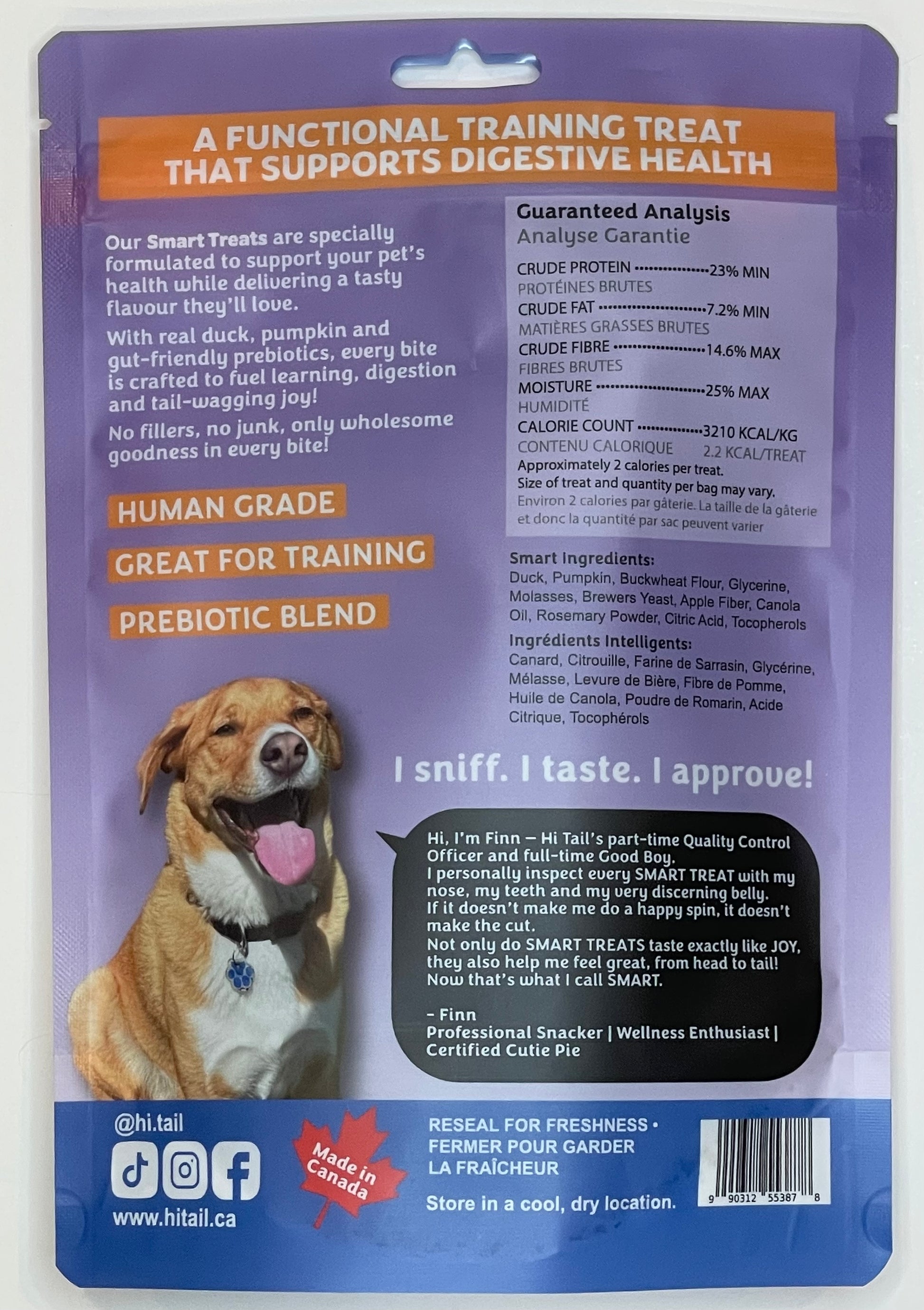 Smart Treats by Hi Tail are delicious, functional training rewards made with real duck, pumpkin, and a gut-friendly prebiotic blend to support your pet’s digestive health. Each bite is crafted to be low in calories and high in benefits, helping fuel learning while promoting a happy belly and overall wellness. These human-grade treats contain no fillers or junk—just wholesome, clean ingredients your pet will love. Proudly made in Canada, Smart Treats are perfect for training, rewarding, and making tails wag with joy.